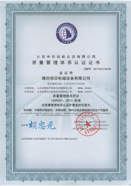 2017年公司通過了北京中交遠航認證有限公司的質量管理體系認證,新的標準已經開始執行,我們注重質量,追求完美,精益求精,歡迎新老客戶光臨惠顧!