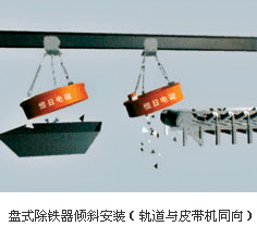 軌道方向:根據現場條件,除鐵器在大皮帶機頭上方吊掛,其軌道可與大皮帶方向垂直或同向。或除鐵器在大皮帶上下山段或水平段止方吊掛,其軌道方向必須與大皮帶方向垂直。